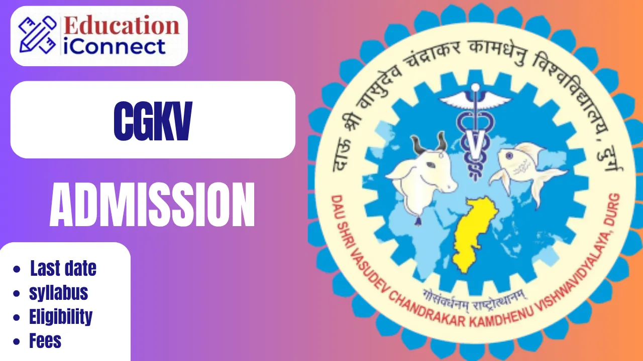 CGKV Admission 2026-27: Chhattisgarh Kamdhenu Vishwavidyalaya offers many programs related to Veterinary Science, Animal Husbandry, Agriculture, etc. Courses for various UG and PG, including B.V.Sc. (Bachelor of Veterinary Science), B.Tech. (Dairy Technology), B.F.Sc. (Bachelor of Fisheries Science), M.V.Sc., Ph.D., etc. To be eligible, students must have completed class 12th or a UG degree with at least 50% marks from a recognized board or university. The admission process is based on entrance exams like CG PAT (Pre-Agriculture Test), AIEEA (for UG), and ICAR AICE (for PG). The application fee is approximately INR 400. The admission form must be submitted to the official website at @cgkvmis.cg.nic.in.