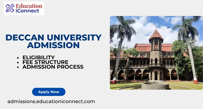 Deccan University Admission 2026: Deccan University offers various UG and PG programs, such as MBA, B.Tech, BA, LLB, MSc, and PhD. The minimum eligibility for admission is passing 10+2 with at least 45% to 50% marks from a recognized board or UG degree for postgraduate programs. An application fee of INR 1000 is required. Some programs may require an entrance exam or merit-based selection. If you want to know more, you can go to the official website, www.dcpune.ac.in.